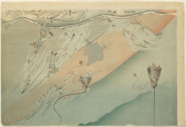 Katsushika Hokusai's "Whirlpool at Awa" is a woodblock print that captures the raw energy of nature. Notice how the composition is dominated by dynamic, swirling lines of water. These lines create a sense of movement and instability, evoking the chaotic power of the whirlpool. The forms are stylized, almost abstract, reducing the waves to their essential shapes and patterns. This simplification intensifies the visual impact, allowing us to focus on the structural forces at play. We can appreciate how Hokusai masterfully uses line and form to convey depth and motion. He challenges our perception of stability and invites us to embrace the transience of natural phenomena. The stark contrast between the detailed waves and the solid mass of the rocks further emphasizes this tension. This artwork is not just a representation of a scene; it is an exploration of the underlying forces that shape our world. The turbulent energy captured in this print reflects a deeper philosophical engagement with the impermanence and dynamism of existence.