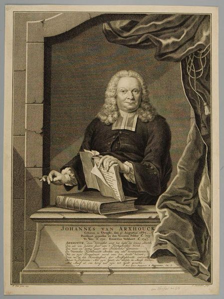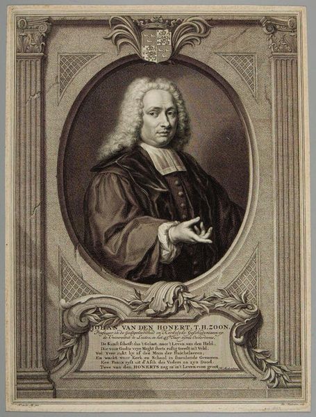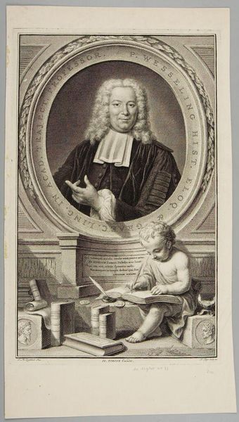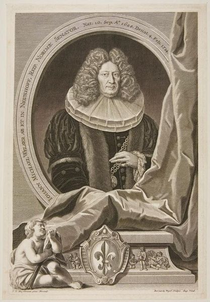 Curator: Here we have Jacobus Houbraken’s portrait of Thomas Sydenham, a prominent figure in the history of medicine. Editor: Wow, immediately I’m struck by how studious and somber it feels. The intricate details almost give it a sense of quiet intensity. Curator: Sydenham’s contributions were revolutionary—insisting on clinical observation, he really shifted medical practice toward a more empirical approach. Editor: Right, and that serpent twining around the staff—a classic symbol of medicine, but here it seems almost restless, like knowledge itself is wriggling free from dogma. Curator: Exactly! The setting and details are all carefully chosen to reflect Sydenham’s stature. Editor: I love how the oval frame suggests both containment and a kind of portal—he’s both a man of his time and someone who seems to be peering out at us. Curator: A testament to the enduring power of art and science, wouldn't you agree? Editor: Absolutely. It's a reminder that even the most serious subjects can be rendered with such beautiful complexity.
