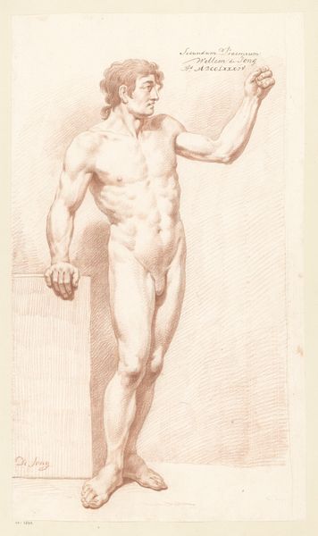 Nicolai Abildgaard painted this oil on canvas, "Male Figure," inspired by Michelangelo's "Last Judgement." The most striking symbol here is the male nude, an enduring motif from classical antiquity, representing heroism, beauty, and the ideal human form. Consider the raised arms: a gesture of surrender, supplication, or even defiance. We see echoes of this pose in depictions of crucifixion or martyrdom, where the body becomes a vessel of suffering and transcendence. It's a powerful expression of human vulnerability. Think of Laocoön, writhing in agony, or even the ecstatic poses of Baroque saints. These gestures tap into deep-seated, collective memories of pain, sacrifice, and spiritual yearning. The dynamism in the figure and the powerful musculature engage viewers on a subconscious level, reminding us of our own mortality and the physical burdens we carry. This enduring symbol resurfaces, evolves, and takes on new meanings, reflecting our collective human experience through shifting historical contexts.