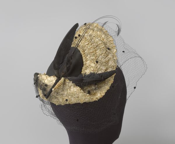 Editor: Here we have a striking photographic image of a "Strohoed van donkerblauw, fijn, glad stro, met witte rand en voile," which translates to a dark blue straw hat with a white trim and veil, dating from around 1950, attributed to Cr\u00e9ation Paris. There is something haunting about its simple elegance, as if it is beckoning a return to mid-century aesthetics. What thoughts does it stir for you? Curator: Well, seeing it conjures up images of poised women attending garden parties or sophisticated soirées. Don't you feel that gentle current of nostalgia pulling you in? It reminds me of when fashion felt less about fleeting trends and more about understated grace. But tell me, do you perceive that slightly melancholic tone emanating from its dark colour palette as well, perhaps alluding to the quiet passing of time? Editor: I hadn’t quite considered the passage of time element, more a classic timelessness instead, if anything, but I think I understand. But, do you find any artistic value beyond its visual representation, perhaps connected to broader social or cultural narratives? Curator: Oh, absolutely. A hat such as this encapsulated aspirations to refinement, elegance, almost a sartorial performance of social identity that feels far removed from the contemporary age of casual attire. As photography, it is a delicate moment – a whisper of days gone by… it holds up memory itself. A powerful statement, don’t you agree? Editor: I see that. It's like a visual poem about memory. This piece truly wears more than what we can immediately see, it evokes a shared nostalgia and silent dialogue with a bygone era, urging us to revisit its subtleties. Thanks for lending your insightful lens. Curator: My pleasure entirely. It’s a shared journey of appreciation, wouldn't you say?