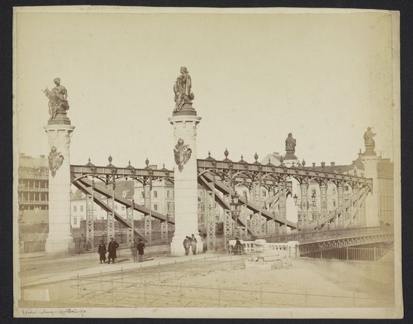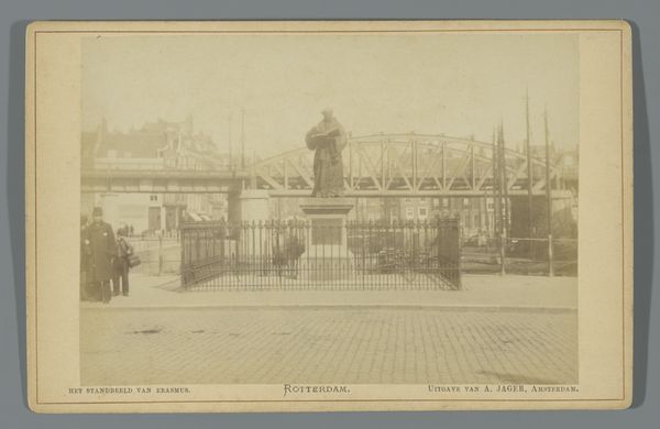 Curator: It’s so subtle; the stillness of the past just hangs in the air, doesn't it? Like an old sepia dream. Editor: Indeed. What we're looking at is a photograph titled "Gezicht op het standbeeld van Erasmus op de Grote Markt in Rotterdam," dating roughly between 1860 and 1900. The Rijksmuseum houses this cityscape marvel, probably captured by Andries Jager. Curator: "Cityscape marvel"... You make it sound so grand! It feels quite intimate to me, though. Look at the details blurred but not gone! Like holding a memory in your hands. It invites one to wonder—what was going through Jager’s mind as he composed it. Was this meant to freeze a moment? Was it to last? Editor: Good questions! I am stuck on its symmetrical and architectonic features. Consider how Jager placed Erasmus at almost a perfect balance with the industrial iron bridge. Then notice the contrast that the sharp geometries create with soft curves of the buildings. Also it is very smart how the statue dominates the light on the center ground but fades the edges, which directs our eye there by framing, so that no visual element breaks away too much from the central structure. Curator: Ah, that bridge! I hadn’t considered how deliberate it could be… Almost feels as though wisdom literally towers above industry! Erasamus stands with book in hand but without arrogance to offer that bit of thought! All held by these gentle lines. The fog softens even more its rough presence on the skyline, blurring, so nothing hurts our eyes. Editor: Precisely. The way Jager plays with the elements directs how we, as spectators engage. In art, a simple arrangement is more than chance! He also does the same thing using photographic chemistry! By slightly overexposing his picture he conveys timeless beauty to the architecture that might otherwises seem, too vulgar. Curator: Timeless beauty… It’s almost heartbreaking, that pursuit of immortality! Maybe that’s why I connect with it so much. Anyway, thinking about it I think Jager sought through Erasmus figure to provide permanence! I appreciate those details so much that seem ephemeral—smoke, figures walking with purpose to the city— all contrasted and preserved to provide to present and future someone to reflect upon. Editor: Right. When examining all angles of aesthetics within the architecture and its framing of that single figure it’s easy enough for anyone see it. We see then that the picture really tells many different stories if you ask or listen! And, perhaps, through these many small windows into time itself something permanent may be captured— Curator: Leaving us indeed with far more than just sepia tones; it's an invitation into reflection. Editor: Yes, that is beautifully put! This photo then provides viewers to explore and embrace its aesthetic, history, symbolism; as well, how technology plays together when creating memory of any given place throughout history!