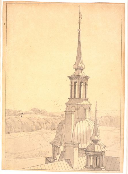 Curator: Before us, we have Christen Købke's pencil and etching drawing from 1834, "Et af de to små tårne på Frederiksborg" which translates to "One of the two small towers at Frederiksborg." Editor: The starkness is striking, a kind of pre-photographic document. Look at that thin, pale application of medium. There's something so minimal, almost skeletal, in its depiction. It focuses my attention acutely on the architectonic forms. Curator: Købke's rendering speaks to the rising Danish national romanticism of the time, when historical architecture became symbols of collective identity, of national memory. The Frederiksborg Castle was especially meaningful after its destruction by fire in 1859 and the subsequent reconstruction efforts, becoming a beacon for the past. Editor: It is all lines! Look closely: he articulates the texture, the shape, and the light exclusively using a delicate web of carefully placed lines. No shading or blending, just pure structure emerging through mark-making. It really showcases how powerfully form can be conveyed through suggestion alone. Curator: The viewpoint elevates us, and by emphasizing verticality, Købke's drawing draws us to consider spiritual and intellectual heights, toward progress and the sky, beyond the merely mundane earthly life. Towers throughout time are associated with not just protection and outlook but also transcendence. Editor: Absolutely. Consider the strategic use of negative space around the towers too—it makes them feel almost fragile, ethereal. You have this tangible architecture rendered in such an open, almost floating composition. That contrast is critical to the mood. Curator: In those fragile strokes, we can perhaps sense a delicate interplay between national pride and perhaps also the recognition of the fleeting nature of time. We see it also in how these small details are not quite symmetrical or "perfect," leaving that humanness and reality in view. Editor: It is true: that visible pencil grid is fascinating. It speaks to process, to careful calculation. It transforms the act of seeing into an analytical procedure, revealing the intellectual scaffolding beneath artistic representation. Curator: The image gives insight into Købke's artistic development and the way 19th-century Danish artists were processing ideas of nationhood through detailed architectural renderings. Editor: Indeed. Beyond its subject, it is that remarkable precision in execution that has made the greatest impact for me.