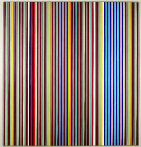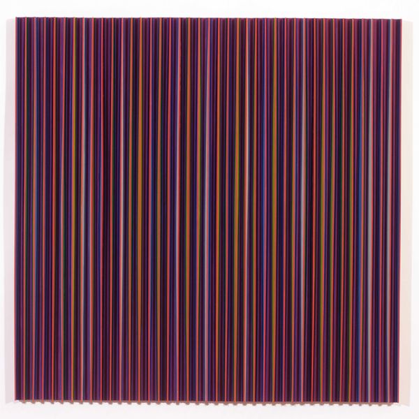 This 'Untitled' painting by Gene Davis is like a visual symphony, made with acrylic on canvas. The way he lays down those stripes, it's not about hiding the process; it's all out there, kinda raw and immediate. The surface has this matte quality, and the colours feel almost built up, layer by layer. Look at how some of the stripes are thicker, some thinner - it's like a visual rhythm that dances across the canvas. I find myself drawn to that cluster of yellow stripes. They pop against the more muted browns and purples, creating this jolt of energy that pulls the whole painting forward. It reminds me a little of Barnett Newman's zips, these vertical lines that aren’t just formal elements but almost portals. The thing is, Davis's stripes are less about grand gestures and more about this playful exploration of colour and space. It’s open, it’s ambiguous, and that’s what makes it so alive.