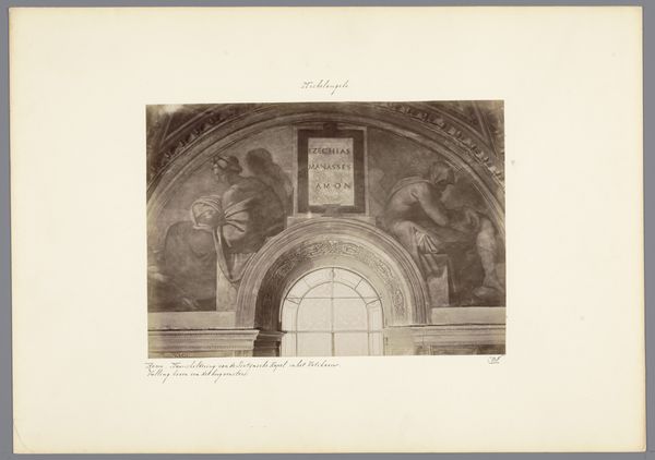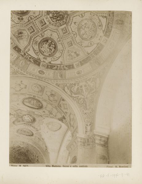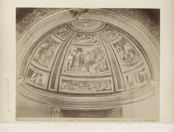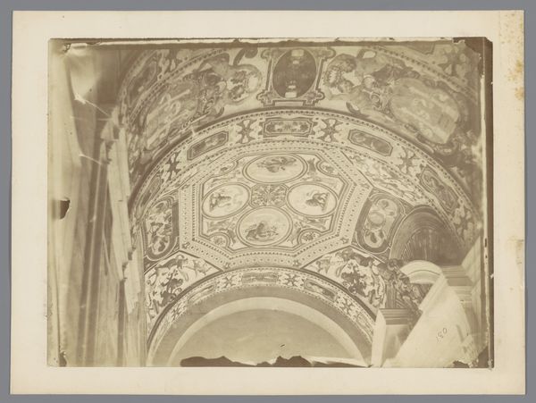 Gustave Eugène Chauffourier created this photograph of ceiling paintings in the Vatican Museums using a black and white photographic process sometime between 1845 and 1919. The image offers a complex interplay of shapes and forms. A dense arrangement of geometric figures dominates the composition. Ovals and hexagons interlock across the ceiling’s surface, each containing painted scenes, possibly biblical narratives or allegorical figures. The monochromatic palette emphasizes the contrast between light and shadow, lending a sculptural quality to the ornate decorations. The photograph plays with perspective and depth, drawing the eye upward into a seemingly endless expanse of artistic expression. The symmetry and repetition of shapes create a harmonious yet intricate visual experience. This approach to composition is characteristic of classical art traditions, where balance and order are paramount. Notice how the photograph acts as both a record and an interpretation of the painted ceiling, capturing the grandeur of the Vatican Museums while offering a unique aesthetic experience through the lens of Chauffourier.