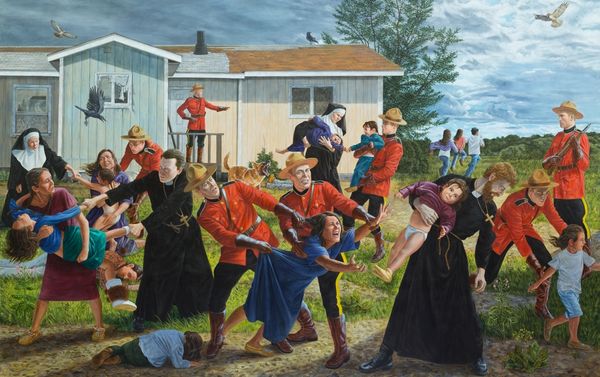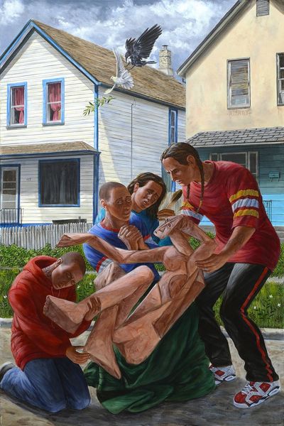 Curator: There’s a very distinct atmosphere to Bo Bartlett’s oil painting from 1986, titled "Object Permanence." Editor: It has this strange mix of staged domesticity and dreamlike surrealism. The coloring is very intentional, giving the scene a slightly muted and unsettling feeling. Curator: Indeed. Bartlett worked very consciously within a tradition of American realist painting, but this piece pulls us into more than just surface reality. It seems to play with ideas of home ownership and the construction of an idyllic family unit. Look at the crisp lines of the house contrasted with the ambiguity of the figures’ gazes and spacing. How might this contrast invite interpretation about consumerism, family values, and even anxieties surrounding the concept of 'home'? Editor: From a purely constructionist standpoint, there is an incredible labor embedded in this painting, reflective of the period in the late 80s in America. Note the attention to detail in rendering each individual, their tools, their clothes and the suburban backdrop; the physical act of creating the painting mirrors the labor-intensive project of building a home and a family. There's a tension there: the 'perfect family portrait' facade versus the hard work required. Curator: Absolutely, it echoes those sentiments. And the scale adds to the effect. We should also examine how galleries showed such a picture back then, what values are validated, how some members of society are valorized while others are obscured or effaced. The title itself points to ideas about existence and representation, "Object Permanence." It’s thought-provoking about identity. Editor: I'm especially drawn to how Bartlett layers those social narratives. I now see the contrast between the apparent stasis of this middle-class construction of suburbia with the precarity and social realities that go into maintaining such a structure. Curator: Very insightful, and those layered contradictions make it more than just another family portrait from the 80s. Editor: Exactly. Thinking about the painting in this way shows it does have this fascinating, enduring commentary.
