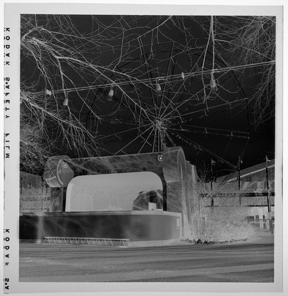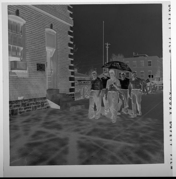 Editor: Here we have Jack Gould's small gelatin silver print, "Untitled (five men walking with one umbrella)." The negative effect gives it an eerie, almost dreamlike quality. What story do you think it's trying to tell? Curator: I love that word, eerie! To me, it's like a memory fading. The men, unified under that umbrella, become a single entity, marching towards an uncertain future. It makes me wonder, what are they united for? What are we all united for, in the end? Is it all just a fleeting moment? Editor: That's beautiful. So, it's not necessarily about the men themselves, but the idea of unity and its potential transience? Curator: Exactly! Art often reflects our own search for meaning. Maybe Gould is nudging us to question the narratives we create for ourselves. It's like a philosophical poem disguised as a snapshot. Editor: I never thought of it that way. Thanks, that gives me a lot to think about.