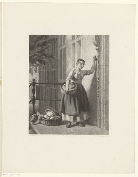 Editor: Andreas Flinch’s 1843 etching and woodcut, “Giv gierne! En pige ved en fattigbøsse” or “Give Alms! A Girl by a Poor Box,” feels so somber. The stark black and white, the girl's downcast gaze...it's undeniably moving. What story do you think Flinch is trying to tell us? Curator: Well, look closer, darling. It’s not just sorrow, is it? There's a quiet dignity in her posture. She isn't begging, is she? It's an offering, a transaction even. Flinch, bless his observant heart, is capturing a moment of societal reflection, isn't he? Consider the "poor box" itself – that inscription, urging generosity. "Give willingly." Almost a gentle chiding, don't you think? Are we so generous without the painted prompt, hm? Editor: That's interesting – the idea of it being almost transactional, rather than simply charitable. I hadn’t considered the power dynamic there. But isn't the setting also important? That brick wall seems to close her in. Curator: Ah, the claustrophobia! Good eye. Yes, walls have tales, haven't they? It might mirror the economic constrictions on young women. Or perhaps a subtle nod towards the limited social mobility of the era, you suppose? We can but imagine, no? I always wonder: did he see her that way too? Trapped within these unyielding structures... Editor: I think I’m understanding a new aspect of this artwork. It is not just an image, but a narrative about social structures. Curator: Precisely. The best art makes us look into a mirror – not to admire ourselves, but to reflect, rethink and ultimately, maybe to even reinvent, sweetheart. Flinch certainly encourages it, no?