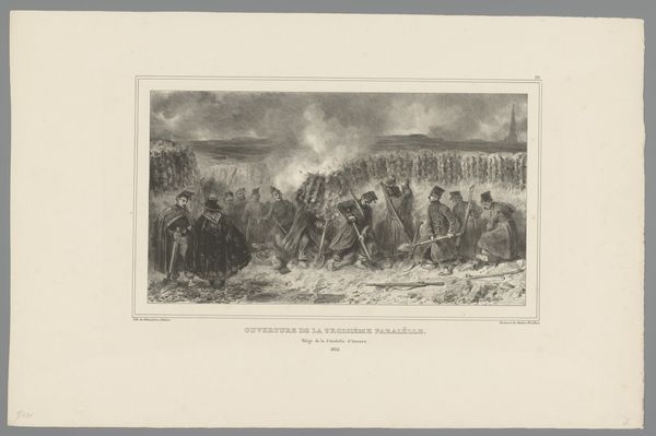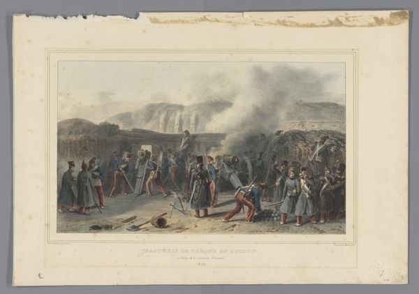 Curator: Auguste Raffet’s lithograph, “Beschieting van de Citadel, 1832,” made in 1833 and held at the Rijksmuseum, captures a military scene with remarkable detail. What strikes you first about this print? Editor: The overwhelming chaos, really. There’s a lot of visual information, a jumble of figures and smoke, almost a gritty feel even within the lithograph medium. Curator: Indeed, Raffet masterfully uses lithography to convey a sense of immediacy. Consider the strategic arrangement of figures and the vanishing point toward the citadel itself; the structure imposes an asymmetrical dynamism across the visual field. Editor: I'm thinking about the physical labor implied here, beyond the obvious violence. The soldiers’ movements, the sheer effort required to operate those cannons—and the immediate aftermath implicit in the smoke. It all points to very strenuous work. What sort of labor was invested into producing this print and distributing it? Curator: Good point. The lithographic process itself involved considerable physical and technical skill, requiring precise drawing on the stone and careful printing to achieve such tonal range and clarity. It signifies a cultural need to record and disseminate such events, thereby becoming itself another method of power exertion. Editor: It is quite Romantic, but stripped of any heroic idealization. More focused on depicting raw, almost industrial aspects of war than glorifying combat. Curator: The print indeed situates us between Romanticism and the dawning Realist depictions. Note, however, the careful management of the light which adds a somewhat ideal quality even amidst what would be perceived as ‘truth’. Editor: The scale feels significant in that respect, too. While modest, it allows for individual ownership and closer scrutiny of these processes of conflict. A material object facilitating reflection, maybe critique? Curator: Certainly, a convergence of craft and documentation that allows us, generations removed, to examine not only the depicted events but also the intricate socio-cultural fabric that birthed this image. Editor: Right, the work extends past Raffet and implicates social forces much bigger than his creative control.