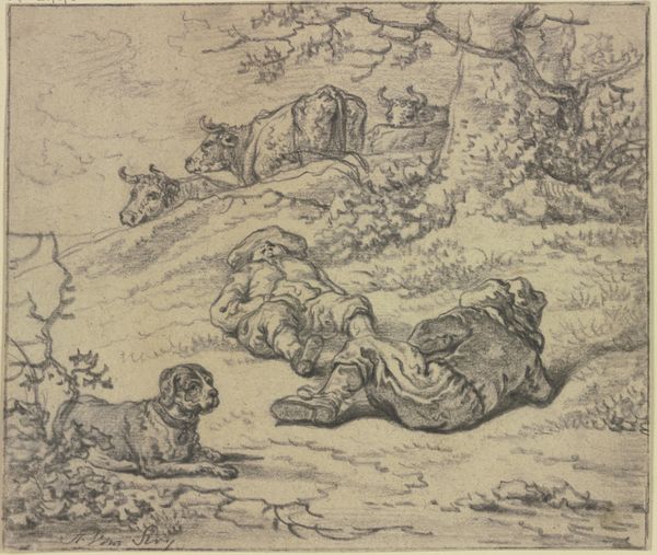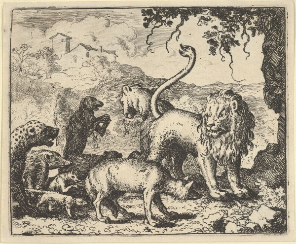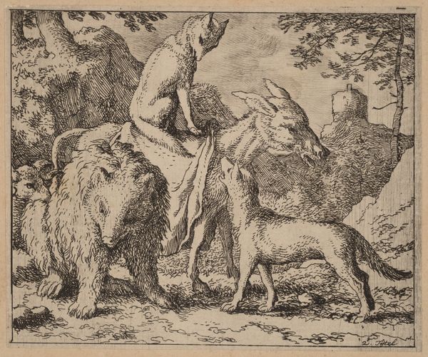 Curator: Allart van Everdingen’s etching, "Reynard's Enemies are Dismayed", dates from around 1645 to 1656. Look closely at the clustered composition, the flurry of etched lines... Editor: It strikes me as darkly humorous, a fable almost. Are those animals confronting a fox? There’s a palpable tension in this scene. Curator: It draws on the medieval cycle of Reynard the Fox, a trickster figure whose cunning allows him to outwit stronger adversaries. Notice how Everdingen uses the crowded space to suggest impending conflict, even a chaotic struggle for power. Editor: Right, it's interesting how printmaking allowed Everdingen to democratize narratives. These stories, traditionally enjoyed by the elite, now become accessible to a broader audience through relatively inexpensive multiples. The act of etching—the biting of acid into metal, the labor involved—becomes part of this transmission. What do the individual animal figures tell you? Curator: They are symbols. The lion, of course, represents authority. The fox is cunning, deceit, and yet perhaps, clever survival. It’s a complex reading because the viewer is put in a position to almost admire the figure because of his ability to succeed, perhaps against oppressive forces represented by the lion and bear. This reflects anxieties during periods of political and economic change. Editor: Thinking about that accessibility again, the detail must have been extraordinary for its time. Imagine the craftsman meticulously rendering these details onto a metal plate, essentially building up tone through labor intensive crosshatching. Curator: And that detail emphasizes the animal’s behaviors – some of them seem aggressive. Everdingen captures each character in a moment of intense psychological charge; there’s no escape from these charged signifiers of violence. Editor: The very act of multiplying this image allows for widespread social commentary. To produce this quantity of work, how was Everdingen working? We should investigate more about workshop assistance, his suppliers of metal, the accessibility and pricing for consumers in this time. Curator: I think this work illustrates just how much these symbols retain power over time, reminding us about both the persistence of such power struggles, as well as art’s social purpose. Editor: Yes, by making the image a physical artifact, open to scrutiny as both material and social commentary, the print allows those themes to multiply through space and time.