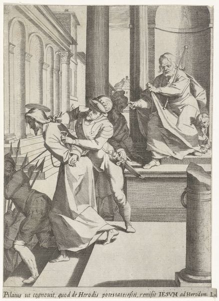This is Giovanni Domenico Tiepolo’s ‘Maria met de heiligen Antonius van Padua en Franciscus van Paola’, made using etching. The composition is arranged vertically, guiding the eye upwards from the steps at the base to the figure of Mary at the top, partially enclosed by an arch. Notice how Tiepolo balances areas of dense hatching with more open spaces, creating contrast that animates the scene. The work uses line and shadow to evoke a sense of depth and volume, carefully modulated to enhance the dramatic quality of the scene. The etching technique allows Tiepolo to create a visual language of nuanced tonality that captures both the physical forms and the spiritual atmosphere of the depicted scene. The architectural details and the figures’ drapery are rendered with a meticulous attention to detail, characteristic of the period's interest in ornate and expressive aesthetics. The etching shows a moment of divine encounter, a scene framed not just by linear precision but by a delicate interplay of light and shadow that speaks to deeper, perhaps ineffable, aspects of faith and artistic vision. It’s a demonstration of how formal elements can converge to articulate complex narratives.