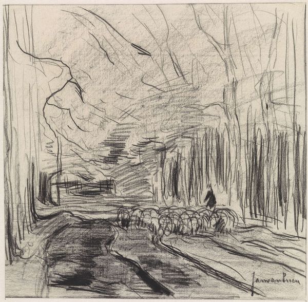 Curator: Here we have Rodrigo Moynihan's "Trees and Undergrowth," a wash drawing held in the Tate Collections. It's a quick sketch, really, of a woodland scene. Editor: My first thought? Melancholy. The monochromatic palette and the almost frantic brushstrokes give it a feeling of transience, like a memory fading. Curator: Indeed. The bare trees reach upwards like skeletal fingers, a symbol of mortality in art. It reminds me of vanitas paintings, alluding to the fleeting nature of life. Editor: But there's also something hopeful, even regenerative, in the undergrowth depicted. Isn't it a potent symbol of nature's continuous cycle, death and rebirth intertwined? Curator: Perhaps it is, but I am left with a sense of nature's indifference to the human condition. Editor: Maybe that's the point. Whether indifferent or regenerative, the power of nature endures, offering a space for contemplation, however somber.