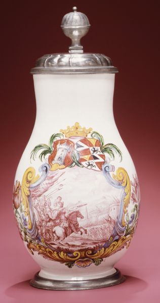 Editor: This beautiful porcelain Beaker with cover was crafted by Meissen Manufactory between 1720 and 1735. The fine details and regal emblems are incredibly striking. What can you tell me about the significance of displaying heraldry on functional objects like this? Curator: Well, the Beaker presents a fascinating glimpse into the intersection of art, power, and societal aspirations of the time. Porcelain itself was highly valued, almost akin to currency, because of its expense and rarity in the West during the 18th century. The inclusion of a coat of arms elevates this from a mere drinking vessel to a potent display of social status and aristocratic identity. Who do you think this object might have been intended for? Editor: Someone of considerable wealth, certainly! The intricate details of the armorial bearings look expensive. Did these porcelain pieces serve any other purpose beyond a status symbol? Curator: Absolutely. Objects like these helped legitimize noble families during a time when power structures were constantly evolving. By consuming beverages from this beaker, an aristocrat wasn’t simply drinking; they were engaging in a performative act, reinforcing their identity and right to power within the complex social hierarchy. The "ARP ES" ribbon, perhaps referencing August Rex Poloniae Elector Saxoniae - King August of Poland, Elector of Saxony - adds to the display. Do you see any contradictions in this kind of artwork? Editor: Hmm, I see a display of wealth, but I suppose there could be tension in how accessible that message was. Most people wouldn't be interacting with, or even seeing, objects like this. Curator: Precisely. While overtly declaring status to those within the social circles who would understand the symbolism, such displays can also implicitly highlight the vast disparities in wealth and power, potentially sowing the seeds of discontent. Reflecting on the relationship between the object, its owner, and the wider society of the 18th century enriches our understanding. Editor: That's fascinating. I’ll never look at decorative art the same way again!