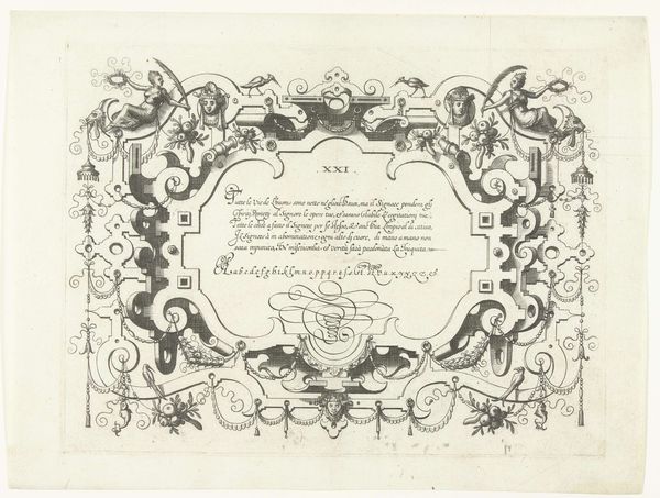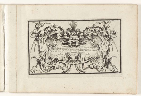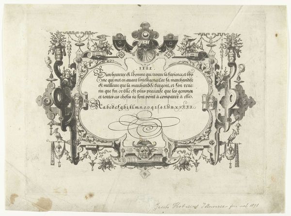 Curator: Here we have an engraving from the late 17th or early 18th century, "Titelprent voor een serie van studiebladen met figuren en paarden"—"Title print for a series of study sheets with figures and horses." It resides in the Rijksmuseum collection, attributed to an anonymous artist. Editor: It strikes me as a meticulously rendered composition, full of classical motifs. The line work is incredibly detailed, evoking a sense of ornate elegance despite its modest scale and materiality. Curator: Indeed. The balance achieved through symmetry and the geometric arrangements are key. Note the allegorical figures with trumpets and flags, flanking what appears to be a coat of arms, all beneath a radiant sunburst. These elements create a visually complex hierarchy within the print's design. Editor: Speaking of design, let’s consider the material process of creating this engraving. The artist’s labor is palpable. The controlled hand needed to carve those precise lines into a copper plate, the physical exertion and the knowledge of applying ink, pressing the paper—there's a history embedded in that act. What was the function of these prints and their accessibility within Baroque society? Curator: Functionally, it was meant as a frontispiece to a series of drawing studies. The text below the cartouche dedication indicates its purpose—serving as a guide for artists learning to draw figures and horses. Its symbolism reflects the baroque fascination with grandeur and skill, but more abstractly speaks to visual representation through complex organization of line. Editor: I wonder about the paper itself. What quality was it? Was it locally sourced or imported? Who were the patrons demanding such intricate works, and what was their relationship to the engraver, Petrus Schenkium, mentioned within the inscription? Those socioeconomic connections inform the visual object on display. Curator: These are insightful questions, directing our thoughts towards material accessibility and the economies of artistic production. The print successfully embodies the visual conventions of the period, prioritizing structured line, detail, and balanced arrangements that give form to the overall work. Editor: Seeing the print through this lens highlights its intrinsic link to social history. The material processes involved reveal much more than aesthetic value alone; they speak to societal structures as a whole. Curator: It brings new perspectives for analysis, where careful observation of lines, forms and space become a journey through production of an era, so to speak.