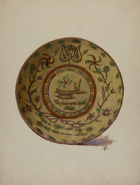 Eugene Shellady made this painting of Pa. German Shaving Basins with what looks like watercolor or gouache, in 1937. What strikes me is the playful looseness of the lines. The color palette is earthy, ochres and browns, punctuated with dabs of green. You can almost feel Shellady circling the shapes with a brush, not too concerned with perfect replication. Look at the bottom basin; see how the paint is applied in thin washes, allowing the paper to breathe. The little floral motif in the center is rendered with such simplicity, a few strokes and blobs, yet it captures the essence of folk art. The top basin has these expressive, almost clumsy letters that frame the central decoration, which for me, inject a sense of humor into the work. The honesty of this piece reminds me of other self-taught artists like Bill Traylor. There’s a raw, unpretentious quality that invites you to appreciate the beauty in imperfection, a kind of art that whispers rather than shouts.