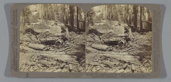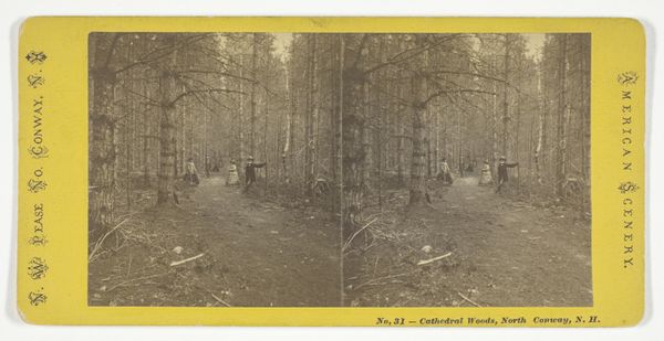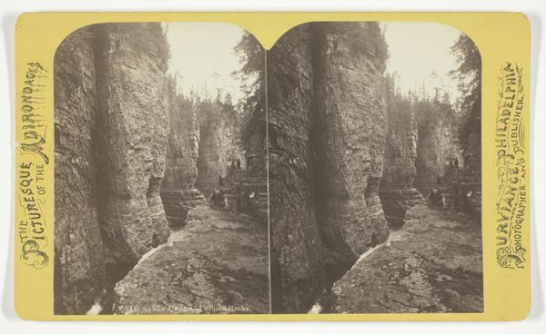 Editor: This is a landscape photograph entitled “The Flume from below, looking up” taken around the mid-19th century by N.W. Pease. I see what appears to be a deep gorge, captured from a low vantage point. The composition is dramatic; it’s almost overwhelming. What exactly strikes you when you look at this piece? Curator: You nailed it, that dramatic verticality! I think what’s so arresting here is the sense of being swallowed by the earth. Imagine yourself down there, craning your neck back… a bit claustrophobic, right? Pease isn't just documenting a place, he's putting us right into the experience of being at the bottom of that flume. There’s that hint of Romantic sublime... Do you pick up on that? Editor: The 'Romantic sublime?' Is that the feeling of awe mixed with a bit of fear, that feeling of insignificance? Curator: Exactly! Remember, photography was still fairly new. These stereo views allowed people to experience landscapes in an immersive way, almost like virtual reality for the 1860s. What I find clever, even humourous, is the human intervention amidst all this imposing nature – a delicate wooden flume, almost like a tightrope strung through this magnificent ravine. Do you get a sense of what might have compelled Pease to frame his shot this way, considering photography’s infancy at the time? Editor: Hmm, I am not sure. I mean, he was pointing his camera toward new technologies... capturing sublime nature as something accessible. This wasn't just untouched wilderness anymore, it was 'scenery.' Curator: Indeed, which makes you consider our modern perspective on landscapes – always balancing appreciation and alteration. Food for thought! Editor: Definitely, this picture has shifted my view! It’s exciting to think of the photographer consciously shaping this narrative.