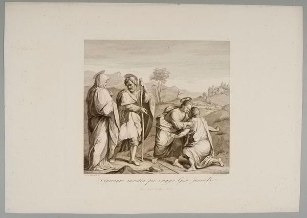 Curator: Angelo Emilio Lapi's "Saint John Baptizing the People" presents a fascinating study in line and form. The dimensions are roughly 36.5 by 53 centimeters. Editor: Yes, the first impression is of a carefully constructed composition, almost staged in its arrangement of figures. The ritual is front and center, of course. Curator: Note the careful balance. See how Lapi uses contrasting light and shadow to define the figures and create depth. The materiality of the plate enhances this effect. Editor: The symbolism of water as purification is powerful here. The bare bodies signify vulnerability, the group in the background hints at community. Curator: Precisely. The artist masterfully uses linear perspective to create a sense of space and atmosphere, drawing the viewer's eye deeper into the scene. Editor: It's also interesting how the image builds on earlier artistic tropes while the figures themselves gesture to a timeless ideal of spirituality. Curator: Indeed. It invites reflection on the nature of grace, the structure of faith and its visual representation. Editor: It’s a reminder of how sacred moments are both personal and communal, filtered through visual language.