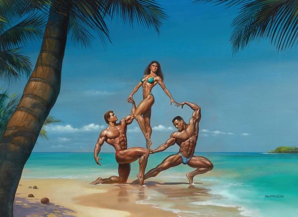 Curator: This oil painting, "The Intruder," by Victor Prezio, dated 1960, offers a rather startling tableau. The composition alone suggests a deliberate arrangement of narrative elements, don't you think? Editor: Absolutely! My initial reaction is... tension. The way the artist has positioned these figures in this wild landscape—the man's palpable fear, the women brandishing spears. And what's with the man in the cage? Curator: Precisely. The color palette also lends itself to that unease. Look at the predominantly muddy yellows and greens, reflecting an unkempt and perhaps dangerous landscape, against which the saturated blue bikinis jarringly pop out of this environment. Editor: Yes, and it reads as a challenge to gender norms and power dynamics prevalent in the '60s. These women are active aggressors, armed and in charge, while the men appear vulnerable—one captive, the other wounded and clearly afraid. Does the narrative speak to shifting roles of the period? Curator: The poses and rendering are hyper-stylized; not what I'd classify as documentary. In other words, it serves as the aesthetic representation of female power rather than reality. Each pose seems engineered for dramatic effect and emphasizes the figures in relation to each other in this very artificial jungle. Semiotics and structural relationships would reveal what seems less of a socio-historical depiction of gender roles, and more of an articulation of male paranoia through visual expression. Editor: I would argue that cultural anxieties about gender roles often manifest in hyper-stylized forms in pulp art of the era. Also consider the erotic overtones here. Even if unintentionally, the suggestive positioning of figures within this jungle scene resonates with historical representations of exoticism and gendered power, reflecting colonial exploitation, and raising the question of female subjugation in relation to historical domination. Curator: Fascinating indeed. But let's not discount Prezio’s use of figuration as an abstraction and manipulation of space here; we see Prezio working through ideas with color and composition to show the emotional landscape and, maybe less to say of social narrative. Editor: Ultimately, what’s undeniable is its compelling ambiguity and commentary that, despite its visual language of pulp adventure, opens complex questions that mirror our society and how we have been changed. Curator: A vivid, if slightly bizarre, scene that invites both close reading and contextual awareness. Thank you.