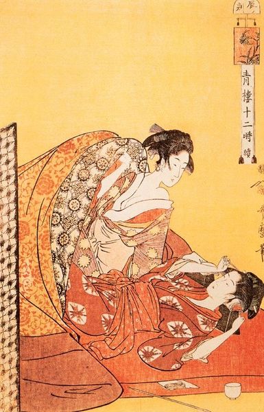 Curator: Just look at the sheer tension emanating from this ukiyo-e print! It's breathtaking how the artist conveys such a visceral moment. Editor: I agree. This scene absolutely crackles with an energy—it feels almost violent. I can hardly believe it's crafted through a relatively controlled medium such as a woodblock print. Curator: The piece you're observing, titled "Ōhara Takejirō Takematsu Subduing a Bald Demon", was created in 1867 by Tsukioka Yoshitoshi. Consider the cultural context—Yoshitoshi was deeply influenced by both traditional Japanese art and the influx of Western artistic styles at the time. This piece shows his master craftsmanship and adaptation. Editor: Yes, indeed, look closely and you see such artful layering of pattern upon pattern—the demon’s almost frantic grasping contrasting beautifully against Takematsu’s controlled pose. Note also the color contrasts--deep black is set off against stark white, and so forth. Curator: Precisely! And to place this within a broader narrative, we must understand the social fabric in which stories of heroic figures and demonic encounters captivated the popular imagination. These were times of intense societal upheaval. Ukiyo-e prints, like this, served as powerful cultural signifiers reflecting the shifting values. They often embodied complex ideas about morality, power, and order, and particularly order overcoming the disordered. Editor: The work feels immediate and raw, yet meticulously constructed. Every element—the lines defining the muscularity of Takematsu, the frantic, desperate gesture of the demon, the carefully placed blocks of red, black, and green—serves a purpose. We see perfect balances and contrasts throughout. It achieves an effect greater than its size would lead you to imagine. Curator: Reflecting on its lasting power, this print is a great testament to art's capacity to mirror anxieties of transition but at the same time offer compelling symbols of cultural identity. Editor: Ultimately, in considering this work, its powerful dynamics urge one to a more critical engagement with historical traditions—particularly its technical ingenuity in evoking drama and raw power, and doing so with the apparent simplicity of graphic art.