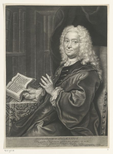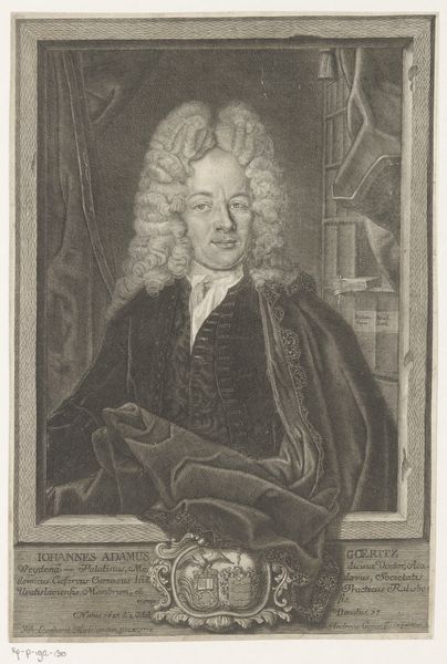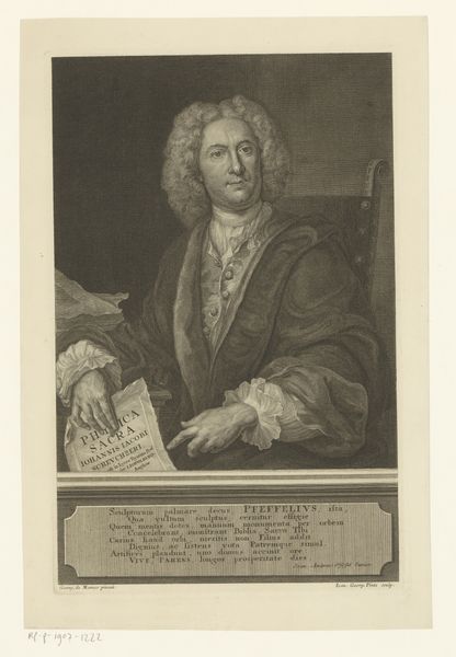 Editor: Here we have Bernhard Vogel's "Portret van Christoph August Lämmermann" from 1736. It’s an engraving on paper and the detail is striking! The man’s robe seems so opulent. What can you tell me about this piece? Curator: Looking at this engraving, I see a very deliberate engagement with the materials and processes of its production. Consider the choice of engraving itself. It's not simply about replicating an image but about creating reproducible copies. Who was the target audience for such a portrait? And what kind of labor went into producing this? Editor: I guess the choice of engraving makes it easier to share around compared to, say, a painted portrait? Would it have been commissioned, then sold, or gifted as a symbol of status? Curator: Precisely. The Baroque style is characterized by detail. However, consider paper production at the time: linen or cotton rags, a laborious process that created a surprisingly strong and stable surface. The cost would indicate a specific type of patronage. Could it be meant for broader dissemination, perhaps to reinforce Lämmermann’s position and legacy amongst his peers and the community? Editor: That makes sense. So, you’re seeing this portrait as an object designed for reproduction and consumption within a particular social structure. Curator: Exactly. By considering the materials and the means of production, we uncover the social and economic forces at play in its creation and dissemination. Who profited? What was valued? The portrait becomes more than just an image, it’s a record of its own making, of power dynamics in early 18th-century society. Editor: Wow, I never thought about engravings like that, beyond the surface image. I'll definitely be looking at art through a different lens now, considering the paper, the engraving process, everything that contributed to its creation and consumption! Curator: That's wonderful to hear. Every artwork has a material history to uncover and it’s important to engage with them.