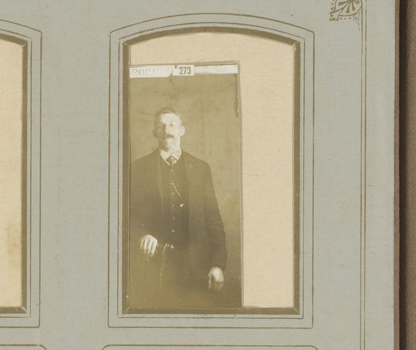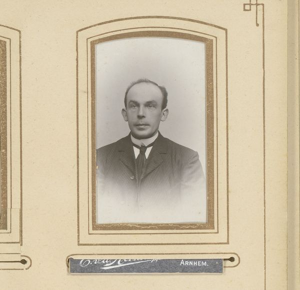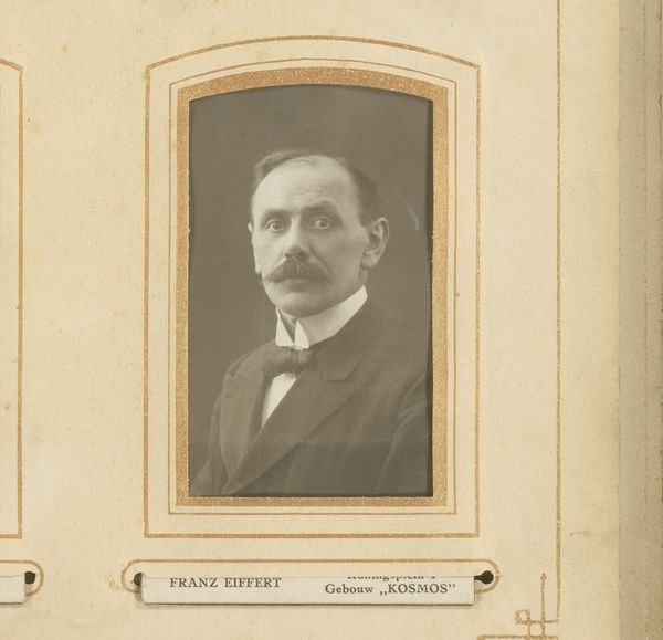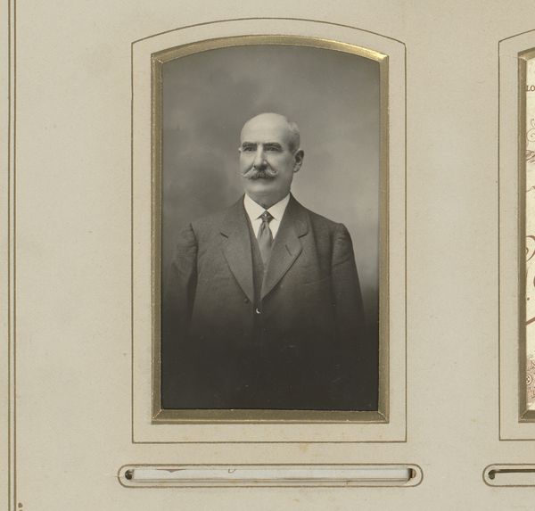 Editor: Here we have "Portrait of a Man with a Moustache" by Jan Bouman, taken sometime between 1906 and 1908. It's a photograph with a decidedly old-fashioned feel; it almost feels like looking into a different world. What do you make of it? Curator: The photograph is fascinating because it offers a direct line to a specific time. It represents more than just an individual; it reflects societal norms and the emerging self-consciousness of the photographic medium. What feeling do you get from his moustache and formal dress? Editor: A sense of propriety, I suppose. Stiff and very proper. Does that resonate with the symbolism of the era? Curator: Exactly! Consider the moustache, for example. In the late 19th and early 20th centuries, it was a potent symbol of masculinity, authority, and even social status. The dark, well-groomed moustache, contrasts against a darker backdrop, what effect does that invoke? Editor: A more intense and powerful one, almost dramatic. The moustache becomes the most interesting part of the composition, it certainly does. Curator: It becomes the marker, something solid and identifiable. Notice also how this presentation, sepia toned and framed within the ornate card, mimicked the aesthetic of painted portraiture which gives this photographic approach even more cultural weight, an elevation of the ordinary person into an art object. Editor: That makes perfect sense. So it’s more than just a picture; it's about constructing an identity and preserving it. Curator: Indeed! Bouman's work encapsulates a transitional moment where photography starts to negotiate its relationship with identity, memory and artistic expression, marking a change in cultural narrative. Editor: I hadn’t considered all of those layers before. Thanks for sharing your insight. It adds so much to what I initially saw. Curator: And thank you! Your youthful perspective brought the man to life beyond just an iconographic reading.