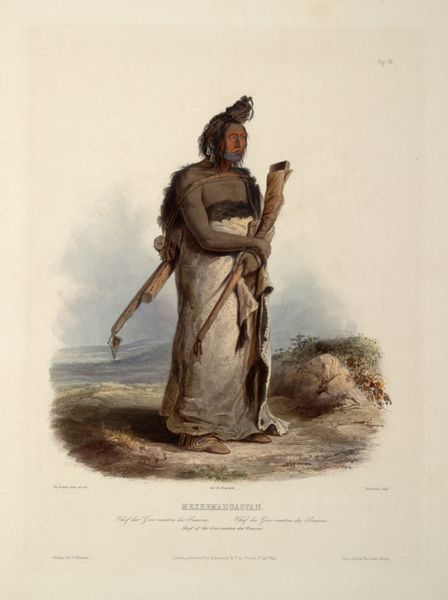 Editor: So this is Karl Bodmer’s “Ptihn-Tak-Ochata, Dance of the Mandan Women,” from 1843. It’s a watercolor and print. I’m immediately struck by the figures; they seem both familiar and remote, dignified, yet the scene feels somewhat… spectral. What do you see in this piece? Curator: I see a gathering, a confluence of symbols deeply rooted in the Mandan culture. The clothing, the headdresses – they’re not mere decoration; they’re visual language. Each element whispers stories of social standing, spiritual belief, and the interwoven connection between humanity and the natural world. Look closely; do you see how the artist depicts not just people but a cultural memory? Editor: You mean in the way their garments seem to define their identities? Curator: Exactly. Each carefully chosen detail, the angle of a feather, the pattern on a robe, transmits specific information. Beyond the immediate depiction of the dance, consider how these symbols perpetuate cultural knowledge, passed down through generations. Editor: So, the dance itself would have a symbolic meaning? Curator: Absolutely! Dances are often ritualistic reenactments of significant narratives. Bodmer, perhaps unintentionally, captures not just an event, but a living archive of cultural identity. What emotional resonance does the dance hold for you? Does it evoke feelings of celebration, solemnity, or something else? Editor: I guess I hadn't really considered how many layers there were! I was more focused on it as just a snapshot of the time. It's really amazing to think about this as a "living archive," as you said. Curator: Indeed, the artist may have thought he was capturing an exotic scene, but inadvertently, he memorialized an intricate system of symbolic communication. A dance of meaning encoded on bodies and repeated in time. Editor: I’ll definitely look at ethnographic art differently from now on!