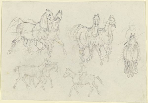 This is George Hendrik Breitner's "Studieblad met ruiters, paarden en runderen," a study sheet of riders, horses and cattle, made with graphite on paper. The composition is a fascinating collection of animal and human forms, rendered in a style that captures movement. Breitner masterfully uses line and shading to convey the musculature and energy of the horses. The loose, sketch-like quality adds to the immediacy, as if capturing fleeting moments. Each figure and fragment, scattered across the sheet, invites us to consider how an artist hones their craft through repetition and variation. Breitner, known for his ability to capture urban life, reveals here the basic elements of his practice. This study sheet is about the artist’s process of seeing and representing. It's not merely the depiction of horses and riders but a semiotic exploration of form and gesture. It reflects the artist's engagement with the dynamic, ever-changing world around him.