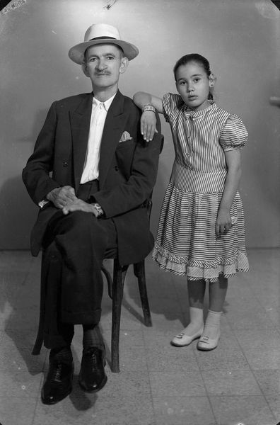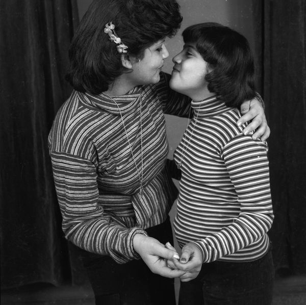 Editor: This photograph, "Son of Lebanese residents in an African country, and a relative," was taken in the 1970s by Hashem el Madani at Studio Shehrazade in Saida, Lebanon. The subjects' clothing and expressions are so intriguing! What do you see in this piece? Curator: It speaks volumes about identity and displacement. Consider the title – it immediately situates these individuals within layered contexts: Lebanese, African, familial. What does it mean to be "of" a place while residing in another? The studio setting, a constructed space, further complicates notions of authenticity. Editor: That makes me think about how identity is performed, especially in a photograph. Curator: Precisely! Madani's work, preserved by Akram Zaatari, becomes a crucial document of transnational lives. How do you think this image challenges or reinforces common perceptions of identity and belonging? Editor: I see now how this portrait captures something much larger about identity and belonging. Thanks! Curator: Indeed. It's a potent reminder of the complexities inherent in our globalized world.