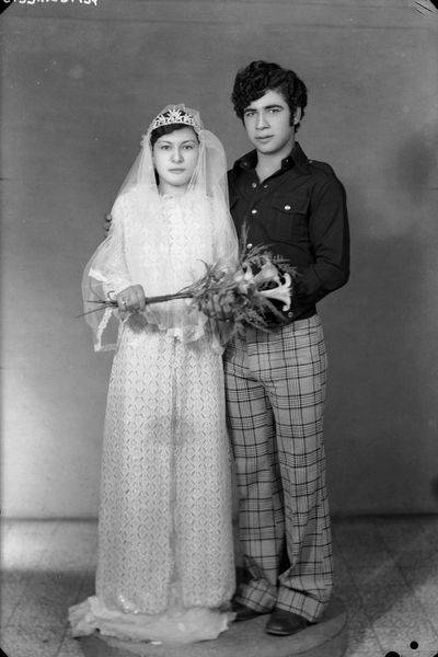 This work is one of a series of black and white silver gelatin photographs of varying sizes that are collectively titled Objects of study/The archive of studio Shehrazade/Hashem el Madani/Studio Practices. All of the photographs were taken by the Lebanese commercial photographer Hashem el Madani between 1948 and 1982 and compiled into the present group, 117 of which are in Tate’s collection, by the Lebanese artist Akram Zaatari. All of the photographs include people, either alone, in pairs or in small groups, and most were taken in Madani’s studio, although some were shot outside and in his subjects’ homes. The series features men and women and covers a wide age range from babies to elderly people. Almost all of the sitters assume poses deliberately for the camera, sometimes accompanied by props or costumes, and most gaze directly towards the lens. Many of the pictures show subjects interacting in various ways, including embracing, kissing and acting out scenes, such as a mock wrestling match. The photographs are mostly tightly cropped, with the sitter or sitters filling most of the frame, although in some cases the figures are positioned further away from the camera, for instance when shown sitting at a table or standing behind a chair. The photographs tend to have sparse backgrounds, often dominated by a blank posterior wall. They are mounted on white paper, displayed in plain white frames and signed on the back by Madani. Many of them have been organised into categories by Zaatari – such as a group featuring men dressed as Syrian resistance fighters and a collection depicting newly married couples – while the rest are presented individually. Zaatari has stated that although he prefers these groups to be displayed together, this is not a requirement (Akram Zaatari, email to Rachel Taylor, 24 April 2008, Tate Acquisition file).