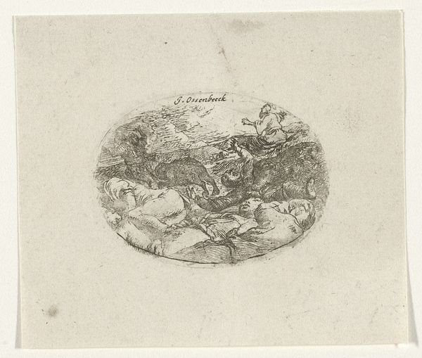 Editor: This is an engraving from the 17th century called "Plafonddecoratie met vrouw tussen dieren en man te paard" or "Ceiling Decoration with Woman among Animals and Man on Horseback." The artist is anonymous. It is held at the Rijksmuseum. It's got this swirling, dreamlike quality; very dramatic. What do you see in this piece, using just formal elements? Curator: Immediately apparent is the complex interplay of light and shadow, skillfully rendered to create a dynamic sense of movement. Observe the sharp contrast that defines forms, lending them volume and presence. How do these visual contrasts affect the overall composition? Editor: Well, the darkness around the edges really draws my eye into the center, toward the reclining woman and all the activity. It also makes it seem more fantastical, almost otherworldly. Curator: Precisely. Consider too the composition itself. The arrangement is notably Baroque, with a dynamic asymmetry achieved through the placement of figures and objects. Note the use of diagonal lines—from the rearing horse to the cascading cherubs. Can you see how that affects your eye's movement across the image? Editor: Definitely. It's very active. My eye jumps around, trying to take it all in. I see the strong diagonal of cherubs balanced by the dark mass of clouds. Curator: A key question remains. Is this successful composition dependent upon other successful works and trends in printmaking, or can its innovation stand on its own? How has the work spoken to you? Editor: I guess it uses similar techniques, like dramatic shading, that were common then, but the unique shapes of the image give it character of its own. Now I'm wondering what other visual conventions have evolved because of this period of work! Curator: It highlights how even seemingly straightforward formal elements are intertwined with period convention. Perhaps you are better suited than most for semiotic study of Baroque printmaking.