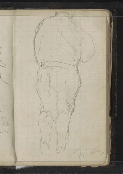 Editor: This sketch, "Matroos met zuidwester," or "Sailor with Sou'wester," by Louis Apol, dating from around 1880-1887, captures a working sailor in pencil. There’s something about its hurried execution that conveys both intimacy and distance. What stands out to you as a historian? Curator: Well, this isn't just a simple portrait. It's a glimpse into the romanticized view of working-class figures that gained traction in late 19th-century art. Apol, better known for his landscapes, is participating in a broader cultural trend. Consider the rise of social realism during this period and its complex relationship with political movements. Does this sketch, in its raw immediacy, challenge or reinforce established power structures of the era? Editor: That’s a good question. It feels… ambiguous. The sailor appears quite stoic, maybe even burdened. Would a middle-class audience at the time have viewed him with empathy, or perhaps with a sense of superiority, admiring a romanticized notion of simple hard work? Curator: Exactly. The reception would likely have been varied and contingent. Furthermore, think about where and how this drawing would have been displayed. Was it part of a public exhibition or kept privately in a sketchbook? These factors would have shaped its meaning and impact significantly. Editor: So, the drawing gains meaning not just from its subject, but from its circulation and reception within particular social contexts. Curator: Precisely! It reminds us that even a quick sketch like this one is deeply intertwined with the socio-political forces of its time. Editor: It’s fascinating to think about how such a seemingly straightforward sketch opens up all these different angles. Curator: Indeed. Art history helps us look past the surface and understand the layered contexts that shape our understanding of art.