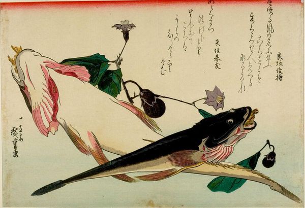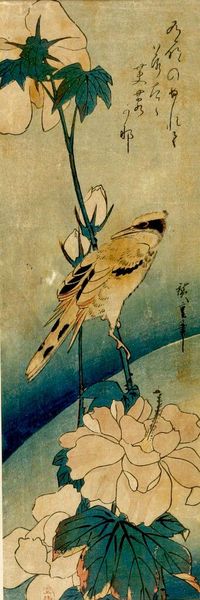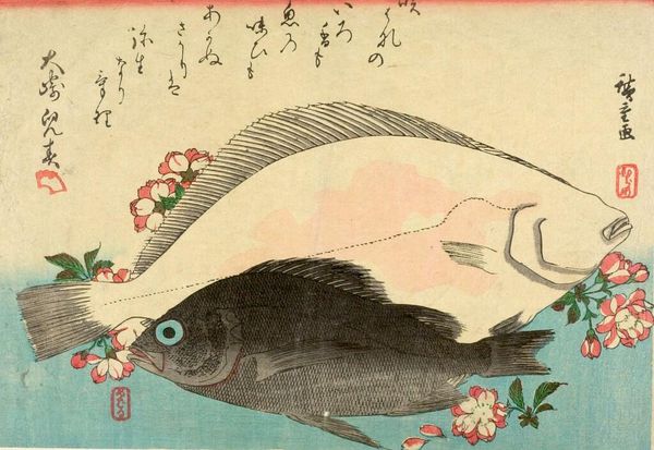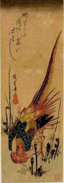 Editor: This is Utagawa Hiroshige's "Ducks and Reeds." It's a woodblock print, quite small. The upper duck is diving headfirst into the water, it's making me feel a bit anxious. What's your take on the cultural significance of this piece? Curator: Hiroshige's prints gained popularity as affordable art, reflecting a growing urban middle class interested in naturalism. How does the accessibility of prints shape public appreciation versus singular art pieces? Editor: That's interesting, making art available to all. So, it's more than just ducks; it reflects societal shifts? Curator: Exactly. The focus on everyday scenes, like ducks, democratized art subjects, reflecting a broader cultural shift. Do you think the realism contributed to its public appeal? Editor: Definitely! It's fascinating how art can mirror society. Curator: Indeed. And it highlights art's role in shaping and reflecting cultural values of its time.