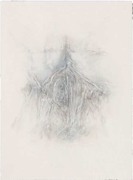 Betty Goodwin's "Passing Through (Nerves Series)" is a work of graphite, colored pencil, and ink that, to me, feels like a distillation of raw feeling. Look at the way the forest is rendered—a dense, scratchy thicket of lines made with graphite and ink, that seem to vibrate with a kind of nervous energy. The branches, almost like tangled nerves, create this claustrophobic space, against which the figure, rendered in soft, muted tones, appears almost translucent. The materiality here is so crucial. The layering of graphite and ink gives a real depth, a sense of something both present and receding. That tension between presence and absence, between the figure and the forest, it's like Goodwin is asking us to consider the ways we move through the world, the marks we leave, and the traces we carry with us. It reminds me a little of Eva Hesse's work, in the way that it embraces vulnerability. This isn't about perfection; it's about process, about the messy, complicated reality of being.