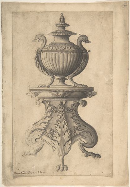 This "Drawing of an Urn" was made anonymously with pen and brown ink, and gray wash on laid paper. The drawing’s material influences the appearance of the urn. The brown ink and gray wash create shadows and highlights that bring depth and dimension to the urn's form. The laid paper provides a textured surface, giving the lines a tactile quality, reminding us of the hand-made. Consider how the artist engaged with skilled traditions of drawing and design, alongside that of craft and fine arts. The drawing depicts an ornate urn with intricate details. The labor-intensive process and attention to detail demonstrate the value placed on skilled craftsmanship and aesthetic refinement during the time it was made. Understanding the materials, making, and context enhances our appreciation for this drawing. It challenges us to consider the relationship between art, craft, and design, recognizing the skill and artistry involved in creating objects of beauty and function.