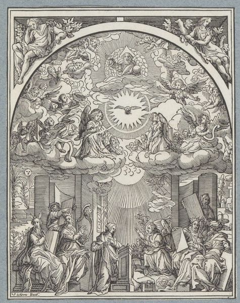 This is Christoffel van Sichem the Younger’s woodcut, “Adoration of the Lamb," made sometime in the 17th century. The composition is divided into two distinct registers, separated by an arc of clouds. Below, we observe figures kneeling in adoration of the Agnus Dei, the Lamb of God, radiating light. Above, more figures surround a seated, central figure. Notice how the linear quality of the woodcut emphasizes the detailed drapery and the expressive gestures of the figures. The entire image is structured around a play of light and shadow, created by the density and direction of the lines. This creates a sense of depth and volume, and also directs the viewer's eye towards the lamb at the center, as well as vertically to the figure in the upper register. The work can be understood as a complex symbolic system, where elements such as the lamb, the books, and the gestures of the figures all function as signs pointing to deeper religious meanings.