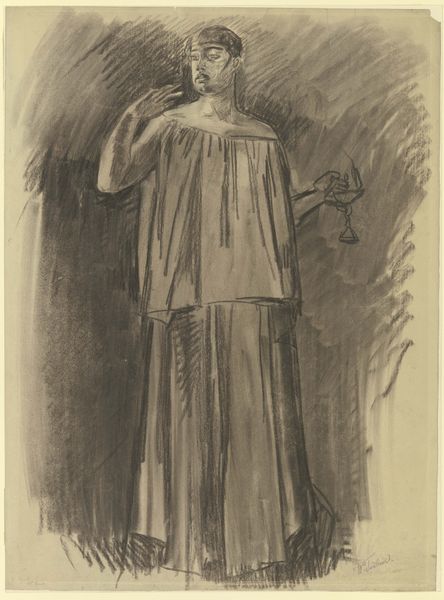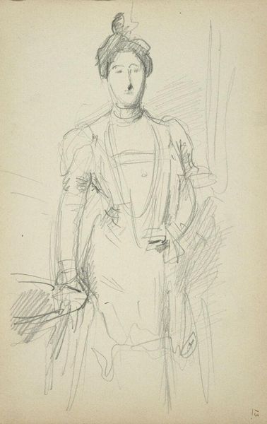 Curator: Here we have "Standing Figure in a Chinese Gown," a lithograph by Theodore Roussel, created between 1890 and 1894. What catches your eye first? Editor: It's the immediacy of the sketch that grabs me. A feeling of seeing a fleeting impression, caught with rapid strokes of pencil. Almost as if Roussel were capturing a memory. Curator: Precisely. This drawing vibrates with the energy of observation. Look closely at how he uses hatching and cross-hatching to suggest volume and shadow. It's less about precise detail and more about capturing the essence of form. Editor: I see it as a sign of the fascination with the Orient that was sweeping Europe at that time, I suppose. What does the Chinese gown tell us? There is an interesting cultural tension. Curator: Absolutely. Orientalism was very much en vogue. But what fascinates me here is that the gown is like a theatrical prop, almost. An everyday garment now infused with this 'otherness'. It’s not a document so much as an imagination *of* the East. Editor: True! You can read it both ways. What seems “authentic” can so easily morph into costume... look at the soft and rather shapeless nature of the gown: not really showing a tailored Asian design here. This suggests to me that she is performing an identity as much as occupying it. Are we even meant to recognize the sitter? Curator: Perhaps not. The face itself is secondary to the flowing lines of the robe. Although Roussel flirted with Impressionism, his artistic project always seems highly designed and considered. Everything on display—subject, medium, technique. The model’s wistful gaze and her positioning close to the side add an unsettling question of ‘escape.’ Or has she been 'cornered' by fashion? Editor: Very good points. Fashion becomes like the bars of a cage? Curator: In a sense! Well, pondering its open yet slightly guarded presence has opened my eyes to some new considerations! Thanks. Editor: Mine as well! Let's stroll onward to freedom!