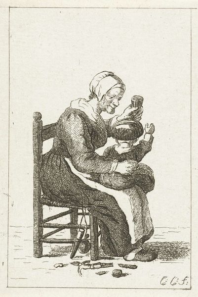 Pieter de Mare created this small drawing, "Standing Woman with Fire Test," using pen and ink. The stark contrast between the white paper and the dense black lines immediately draws us into the character's expressive features. Notice how the sharp, angular lines define her face, exaggerating her features. The cross-hatching technique used to create shadows adds depth, yet it also flattens the image, emphasizing the graphic nature of the work. Her posture, slightly bent, and the extended arm create a dynamic diagonal line across the composition, countered by the verticality of her figure. This isn't just a portrait; it is a study in lines and form, capturing a moment of drama. The pen strokes vary in thickness, adding texture and visual interest. Mare’s choice to focus on expressive line work rather than detailed realism invites us to consider how form can convey meaning. The simplicity of the medium, combined with the complexity of the subject, challenges our perceptions of portraiture.