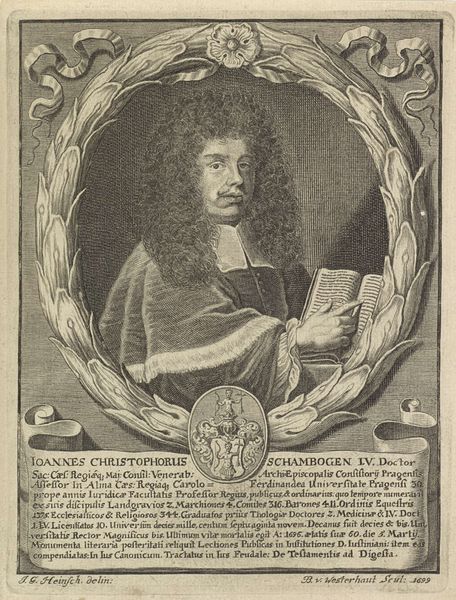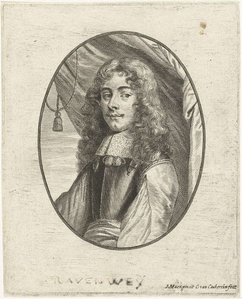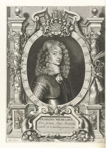 Editor: This is a portrait of Louis XV, King of France, created sometime between 1720 and 1750 by Coenraet Waumans. It’s an engraving, currently held at the Rijksmuseum. The detail is striking for this medium. What formal elements stand out to you? Curator: The first element that captures my attention is the careful control of line and texture to construct a regal, if somewhat rigid, composition. Observe the contrasts – the smooth, polished armor versus the delicate, almost feathery curls of his hair. What purpose might this juxtaposition serve, visually? Editor: Perhaps to emphasize both his power as a king, and his aristocratic status. It makes me wonder, though, if that contrast creates a visual tension that slightly undermines the image’s intended message of authority? Curator: Indeed, an insightful observation. Note also the oval frame that encloses the subject. This immediately confines and orders our gaze. This shape lends to the portrait a structural stability. Is this artistic intention or something else entirely? Editor: That’s fascinating, because it simultaneously contains and showcases him, adding to the overall sense of controlled power but then maybe that is what defines royal portraiture? I hadn’t really considered it that way before. It makes you focus in on him in a striking way. Curator: Exactly, by examining formal aspects we start to observe some crucial, interesting insights!