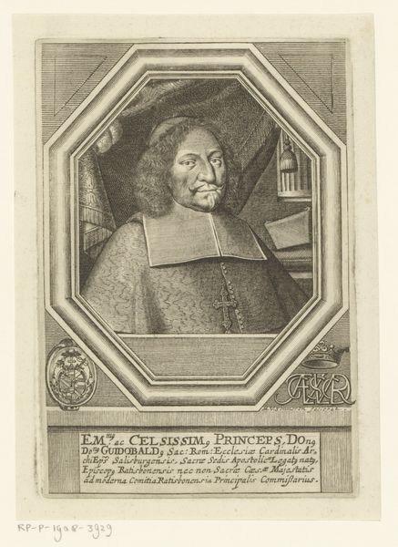 Curator: This print, housed here at the Rijksmuseum, is a portrait of Michael Stemler, created sometime between 1702 and 1763 by Johann Benjamin Brühl. Editor: There's a somber dignity here. The sitter's gaze is direct, almost challenging, isn't it? And the stark contrast emphasizes the folds of the drapery and his clerical collar. Curator: Yes, and observe how Brühl employs hatching and cross-hatching techniques throughout to model form and generate a sense of volume within the composition. Notice particularly how the ovoid border serves to compress the image and focus attention on the figure's expression. Editor: That oval frame certainly adds to the symbolic weight, like an icon contained and venerated. His book suggests learning and religious authority, anchoring him within the intellectual traditions of his time. Perhaps even implying the heavy weight of knowledge or scripture. Curator: Interesting point. Semiotically, we can interpret the book as an essential signifier that reinforces the figure’s role. Beyond its basic function as an object, it indicates his professional identity and the context within which he operated. Editor: And the architectural element below the oval, the pedestal with its inscription. That suggests a foundation—Stemler is not merely a man, but a figure built upon theological principles, memorialized for his role. It speaks to enduring faith and legacy. Curator: The print, as a reproduction, offers an insight into the hierarchical nature of art itself. Its purpose was presumably didactic: an image reproduced to spread knowledge of an important theological figure of the era. The medium becomes an intrinsic element of the image's purpose. Editor: Brühl and Stemler—artists and theologians leave enduring traces of themselves. A fascinating dialogue, across the centuries, of faith, image, and authority. Curator: Indeed. In its structure and deployment of graphic means, this print encapsulates core concerns of Baroque visual culture and offers much scope for extended analysis.