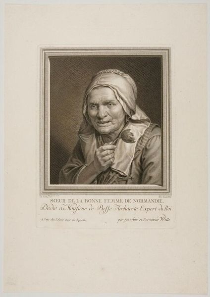 This engraving, *Oude vrouw met tulp in de hand*, was created by Johann Georg Wille. The monochrome palette enhances the detailed lines and shading, drawing our attention to the textures and the composition. Framed within a rectangular border, the woman is set against a subtly patterned backdrop. Note the deep etching that forms the wrinkles of her face, contrasting with the smoother textures of her headscarf and the tulip she delicately holds. This juxtaposition of rough and smooth highlights the frailty of age against the freshness of nature. The artist plays with the formal device of the frame to create a window, inviting the viewer into an intimate, almost voyeuristic, engagement with the subject. Wille’s technique uses line and form to evoke a sense of presence, questioning the boundaries between observer and observed. The framing functions not only as a visual element but also as a conceptual device, mediating our relationship with the artwork and its subject, leaving us to question what lies beyond the frame.