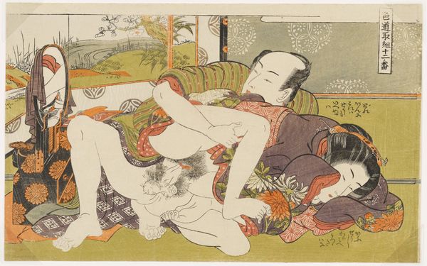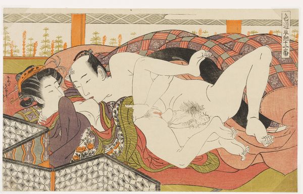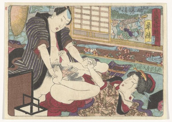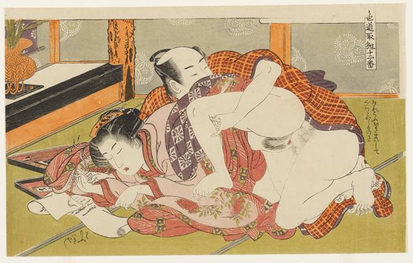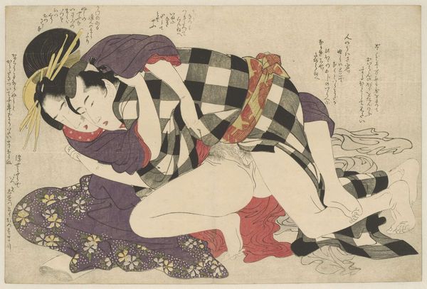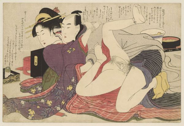 Editor: So, this is "In de buitenlucht," a print by Katsushika Hokusai, dating from 1815-1823. It’s part of the Rijksmuseum collection. It definitely grabs your attention, a bold composition, but… I’m not entirely sure what to make of it. How do you interpret this work? Curator: Well, this ukiyo-e print challenges the viewer, doesn't it? We're immediately confronted with power dynamics, the gaze. The woman's passivity contrasts sharply with the man's action. It prompts questions about female agency and the construction of desire within the historical context of Edo-period Japan. Who benefits from these representations, and whose stories are silenced? Editor: I hadn't thought about it in terms of power dynamics. It felt… intimate, but I see what you mean. Is this a typical representation of women at the time? Curator: That's a crucial question. While ukiyo-e prints often depicted idealized women, often courtesans, this particular image leans into eroticism, but through a lens that demands we consider gender roles and social expectations. Think about how the male figure controls the scene, visually and physically. This control underscores the patriarchal structure prevalent in that society. Is the female figure really "in de buitenlucht", or exposed, vulnerabilised? Editor: So, you're suggesting it’s a commentary on the objectification of women in that era? Curator: It's not a straightforward endorsement or condemnation. Rather, the work operates as a mirror reflecting existing social relations. Our job, as viewers, is to critically engage with those reflections, considering the intersections of gender, class, and power. Does that resonate with you? Editor: It does now. It’s fascinating to consider how something seemingly simple, like a print, can reveal so much about social and political realities. Curator: Exactly. And remember, art is rarely neutral. It actively participates in shaping our understanding of the world, and vice versa. The conversations we have with art objects, especially from the past, are also conversations with ourselves. Editor: This has definitely opened my eyes to a more critical way of viewing art. Thanks!