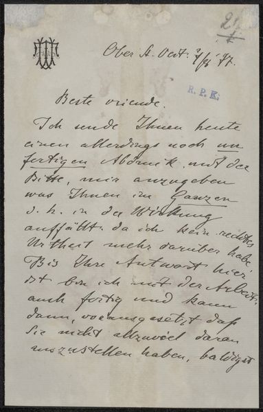 Curator: Willem Bastiaan Tholen penned this "Brief aan Frans Buffa en Zonen," potentially in 1889. It’s an ink drawing on paper, now residing here at the Rijksmuseum. Editor: Looking at this, I’m immediately struck by its intimacy. It feels so personal, like stumbling upon someone’s private thoughts. Curator: Exactly. Letters were powerful tools in the art world. This missive offers us a glimpse into the late 19th-century art market through Tholen's professional and personal interactions. The recipient, Frans Buffa en Zonen, would have been a notable art dealership. Editor: I imagine letters like these were essential in the social construction of artistic value. These dealerships, these communications, effectively certified or legitimized an artist's work for collectors and patrons, reinforcing pre-existing hierarchies within the art market. Curator: Precisely. The materiality of the letter adds another layer, too. Tholen uses ink on paper, common for the time, and his penmanship reveals something about his character and status. Consider who had access to literacy, time, and materials. Editor: It also highlights the power dynamics between the artist and the dealer. The tone in these letters could suggest dependence, but perhaps also a subtle negotiation for control over the artist's representation and, of course, pricing. It's not just about the artistic merit; it is about capitalism and visibility. Curator: These communications were crucial in constructing and reinforcing artistic careers. Analysing it this way means that we are acknowledging Tholen as part of a wider cultural matrix. His social positioning directly affects his visibility, the art market, and more. Editor: So by considering this artifact within its broader context, we see that the artistic 'genius' doesn't operate in a vacuum. Tholen's success was contingent on these social interactions. Curator: And it illustrates how art history can benefit from including broader political and economic conditions in our readings of art, including considering themes related to gender and power structures in the nineteenth-century. Editor: Absolutely. This is more than just a letter. It's a document of art world economics and human relations. Curator: Thank you, your comments bring nuance to understanding of 19th-century Dutch Art!