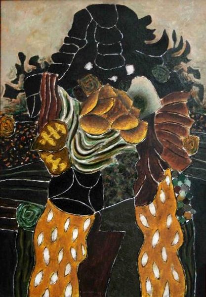 Curator: Take a look at "Hanging Garden," a 1996 watercolor by Ion Alin Gheorghiu. What strikes you first? Editor: The deep greens and blues, juxtaposed against those chalky, almost architectural shapes… It feels like a secret garden blueprint. Slightly unsettling, but with an undeniable earthy charm. Curator: Gheorghiu’s work, particularly in this piece, often explores themes of organic growth through the lens of abstraction. It seems his grounding in Post-Impressionism offers a sense of familiarity while inviting multiple readings. Editor: Familiar is interesting here because I also get this alien-botanical vibe too, something cultivated but completely unknown. The contrast in textures between the solid, darker colors and the wispy lines, the whole thing oscillates between comfort and mild unease. Is that intentional? Curator: I'd say that Gheorghiu is really engaging in the exploration of tension – the comfortable and the chaotic. There's a sense of depth too that, even if abstract, feels referential of a landscape; maybe his inner landscape more so. Editor: The title itself is pretty provocative too, right? ‘Hanging Garden’ evokes all those images of Babylon and fantastical realms, but what's suspended in this context seems more conceptual. Like thoughts hanging in mid-air. Curator: I’m fascinated by the shapes outlined in what seems to be negative space as opposed to the blocks of colour. It encourages my imagination to see multiple things at once, be that eyes in the forest or archways on an old city. Editor: The way you articulate the sensation that emanates from this painting makes it very tempting to meditate on it as long as possible, Curator. Curator: Thank you, Editor, for providing insight in the strange inner life of Gheorghiu.