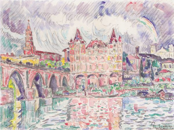 Editor: Here we have Paul Signac’s "Port De La Rochelle", a watercolor illustration that evokes a light and airy atmosphere. I am fascinated by how Signac used these translucent washes to capture the bustle of the harbor. What stands out to you? Curator: For me, it’s about positioning Signac and this port scene within the broader narrative of societal shifts at the turn of the century. Consider the political and social implications of representing leisure and industry side by side, particularly in a port city that would have been central to trade, colonialism and migration. The delicate washes soften this potentially uneasy alliance. Do you feel a sense of romanticism or tension in that context? Editor: That’s a side I hadn't fully considered. The loose application and colors had given me a pleasant impression, but placing the scene in its historical context certainly changes the interpretation. The shimmering water and soft sky maybe are less about beauty and more about Signac responding to the changes of the world. Curator: Exactly. Now, look closer at the architectural structures depicted – those towers, that dome. How might they symbolize power structures or perhaps resilience against social upheaval? The vibrant reflections of the boats on the water might be a suggestion about the dynamic lives and work that sustain them. Signac’s focus invites conversations about labor, class, and the evolving role of urban space in a rapidly changing society. What connections do you make? Editor: It’s fascinating how looking through a lens of social history can really alter one's viewing experience. Thanks, I'm leaving with a deeper perspective of Signac’s work. Curator: My pleasure, it is important for us to always think critically.