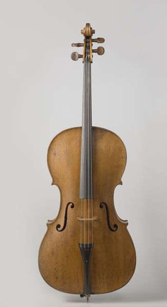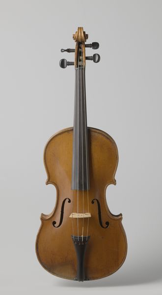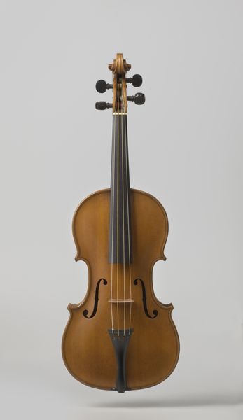 Curator: Look at this exquisite violin! Crafted by Giovanni Paolo Maggini around 1610, it’s a superb example of early 17th-century instrument making. It’s mostly made out of wood. Editor: My first thought? Serenity. Its smooth lines and honeyed tones of wood suggest a tranquil, almost melancholic tune just waiting to be played. I feel drawn into its gentle geometry. Curator: Exactly. Maggini, known for his innovative approach, likely drew inspiration from geometric forms found in nature and architectural designs of the period. Observe how the f-holes mimic a stylized human form. Editor: Fascinating. I see a dance of contrasting curves against rigid lines, a conscious interplay of opposing forces, creating tension, directing your eyes all along the body to the tuning pegs up top. It begs questions about how its maker saw his work, like a bridge for harmonic structures? Curator: Without a doubt. Instruments like these went far beyond simple tools for music. Crafted during a golden era of both scientific discovery and heightened spiritual inquiry, such a violin symbolized perfect harmony, as well as a quest to capture some divine music—like an earthly manifestation of some greater celestial tune. Editor: It’s the details for me, really: the wear patterns along the violin’s body and the scratches speak of countless performances, practice, and its journey across centuries. It adds layers, weaving another tune on this instrument, a subtle dialogue between material and musician. I like that it hasn’t been cleaned! It's proof of existence. Curator: Definitely. Imagine what this instrument would have sounded like in its original time! And its silence now somehow heightens that imagination. Editor: Yes, indeed. In its graceful silence, one starts to listen deeper for a timeless resonance. The echo of the notes once created will keep sounding... always.