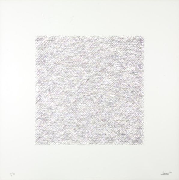 Curator: This intriguing print, by Sol LeWitt, now residing in the Tate collection, presents an intriguing exercise in conceptual art. Editor: It looks like rain—calm, insistent, the kind that makes you want to curl up with a book and a cup of tea. Curator: Indeed. LeWitt's conceptual approach emphasizes the idea over the execution. The means of production become quite fascinating, don't you think? The labor, the repetition. Editor: Absolutely. It's a minimalist haiku in blue ink. It's kind of meditative, how a simple action repeated creates such a complex texture. Curator: And it really challenges the boundary of high art, as we explore the repetitive labor inherent in its creation. Editor: It's almost like counting raindrops. Beautiful in its simplicity. Curator: Absolutely, and that simplicity allows us to unpack these ideas about art-making itself. Editor: True, its essence echoes in its quietude.