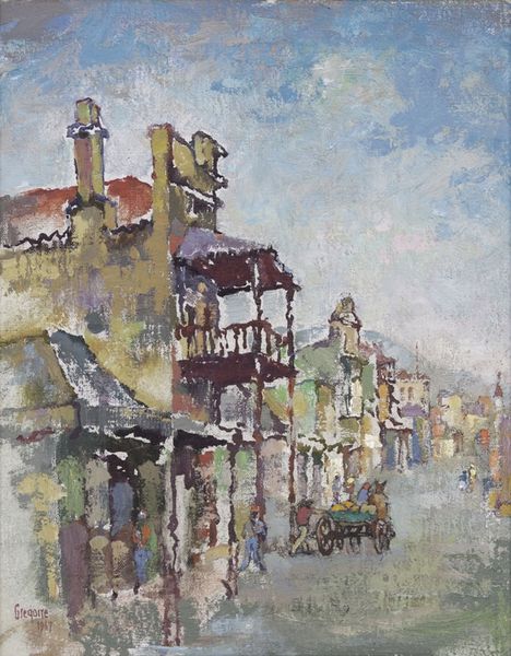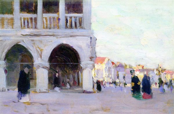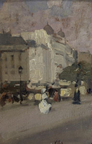 Curator: So, "Case la Vitre," by Nicolae Grigorescu. No date is listed, but it looks to be oil on canvas in an Impressionist style. I'm immediately drawn to its subdued palette, kind of melancholic. What do you make of it? Editor: I get that melancholic feel too. It’s such a blurry image though. I wonder what was going through the artist's head as they painted this. Were they intentionally going for the dreamy quality? How might this cityscape have been received in its time? Curator: Good question. I see it through the lens of its probable "plein-air" execution. The hazy rendering aligns perfectly with Impressionism's focus on capturing transient light and atmosphere. How does the genre-painting tag and focus on “ordinary” subjects reflect contemporary urban change? Editor: That makes a lot of sense. So it wasn't just about aesthetics, but also a reflection of social change and the changing role of art, of imagery, itself? Curator: Exactly! The “everydayness” of the scene, the people casually going about their business in the semi-blurry distance: How do we even display the hustle and bustle? Who has time for this and why are they so unhurried? Think of it as capturing a fleeting moment in a rapidly modernizing society, right? Who is he painting this for? Editor: Interesting. It seems like the value is not only what is represented, but how, and *why* that ‘how’ came to be. To have people engage and relate to the urban scenery and find some beauty in this moment… Curator: Precisely. Grigorescu here places an emphasis on that “fleeting moment” amidst urbanization. Also, if art were becoming more and more accessible through print media, who did art need to serve? Where does it fit in social and political contexts? Editor: I learned so much! I'll keep this cultural context in mind for analyzing paintings moving forward. Thanks! Curator: My pleasure! Art opens so many conversations for us all to enjoy.