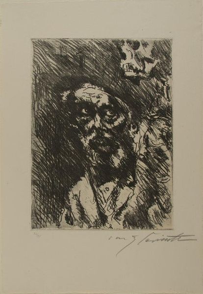 Lovis Corinth created this etching, "Death and the Old Man", sometime between the late 19th and early 20th centuries. It’s a stark image, typical of the period's obsession with mortality. Corinth was working in Germany, a society wrestling with rapid industrialization and social change. The turn of the century saw both great optimism and deep anxiety, reflected in art that often confronted difficult truths about human existence. Here, the skeletal figure of Death looms over an aging man, a visual metaphor for the inevitable end that awaits us all. The rough, expressive lines of the etching enhance the sense of unease and highlight the psychological weight of the scene. To fully understand this piece, one might delve into the cultural and intellectual history of the era, exploring philosophical texts, literary works, and even medical discourses on aging and mortality. The meaning of art is always contingent on its historical moment.