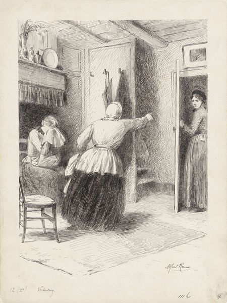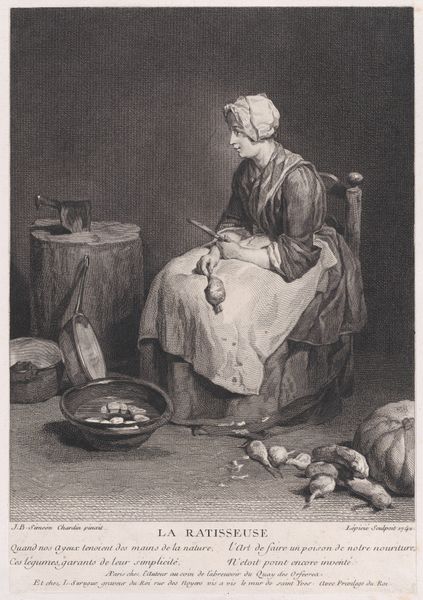 Curator: Oh, this is "The Return from Market" by Bernard Lepicié, created in 1742. It's a beautiful example of Rococo genre painting, a print and drawing currently housed at the Metropolitan Museum of Art. Editor: It's striking, isn't it? I am immediately drawn to her expression—a mix of weariness and maybe a touch of worry? Curator: I think you've captured the emotional nuance quite well! Lepicié perfectly represents a common theme of the period, which is the portrayal of everyday life, idealized yet also touching upon the economic realities for working people. Editor: The detail is incredible! You can almost feel the weight of her market bag. What I am wondering is about the figure in the background, the woman standing in the open doorway behind the first figure. What does that placement indicate about their respective roles? Or how were audiences likely to interpret the interaction between them? Curator: Interesting, isn't it? The positioning is quite deliberate. Lepicié plays with the idea of domesticity and class differences, and the contrast highlights how the spaces might be differentiated. What I'm really pulled towards, though, is that even in what could be a bleak domestic scene, Lepicié manages to give his central figure a delicate grace. Editor: I appreciate that, I think the graceful realism you mention is also reflected in the material details—the rough texture of the baskets, the slightly askew bottles near her feet. And the woman, in turn, offers us, the viewers, an unspoken and knowing glance. Curator: It certainly makes one wonder about the stories behind the captured scene! Looking closely, it is easy to lose yourself within this seemingly simple domestic scene. Editor: Indeed, I leave this artwork with a feeling of lingering contemplation of 18th-century economics. What a captivating insight from Lepicié into lives long past, and lives still very close to us in the now!