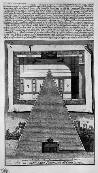 Curator: Here we have an etching by Giovanni Battista Piranesi titled "Elevation of the inside wall of the ruins of the castle and the events of the external details related to the bed and fistulas water distribution." Editor: Wow, that title! A mouthful, isn't it? But honestly, the print itself gives me this intriguing sense of order amid chaos. Look at those precise lines, almost clinical in their detail, juxtaposed with what appears to be the crumbling remains of…something grand? Curator: Exactly! Piranesi's work often grapples with that tension between the grandeur of the past and the decay brought about by time. He's working within a well-established artistic interest in ruins, particularly in the context of the Baroque fascination with dramatic perspective and the ephemeral nature of human achievement. The “bed and fistulas water distribution,” for instance, point to a very specific infrastructural concern, something absolutely vital yet ultimately subject to the ravages of time and neglect. Editor: It's like a forensic examination of a dream, isn't it? You've got this beautifully rendered diagram, but what's it mapping? The corpse of a castle’s water system! I get this real melancholy feeling. Like history is weighing on the page. I can almost hear the echoes of flowing water, now silent. Curator: And that melancholy speaks volumes about Piranesi’s relationship with antiquity. He both revered and critiqued Roman architecture. By meticulously documenting these ruins, he calls attention to the decline of a once-powerful empire. There is also a political critique interwoven here; he points to contemporary failures in properly managing and preserving ancient waterworks in Rome. Editor: You know, the longer I look, the more it reminds me of one of those architectural blueprints mixed with a coroner's report. There's such… stillness in this scene. Curator: Precisely, Piranesi’s fusion of architectural precision with almost dreamlike detail invites us to reflect on our own place in history. Editor: Yeah, there’s something incredibly human about meticulously documenting something that's fundamentally broken and fleeting, a sort of meditation on decline, I think. Well, now I have something to contemplate on my walk home. Thanks for this perspective. Curator: My pleasure. Let’s remember the silent narratives etched into these crumbling stones. These are historical traces we must preserve for a more equitable and enlightened future.