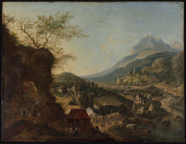 Curator: What strikes me about Anton Mirou's "Hunter and Horsemen on a Wooded Road, with a Village in a Valley beyond" from 1608, held at the Rijksmuseum, is how the everyday intersects with something almost mythic. Editor: My initial feeling is of tranquility, almost melancholic. The subdued palette and the receding landscape invite introspection, like peering into a dream. It’s quite a detailed oil-painting on wood. Curator: Absolutely. It embodies a sort of baroque spirit through its composition: see how he organizes it in these three planes to lead the viewer’s eye into the depth? In terms of cultural symbolism, it highlights a connection to the land that was deeply important in 17th century life in Europe. Hunters were important cultural figures and even archetypes within aristocratic societies. Editor: Yes, and the juxtaposition of the hunter figure – representing control, perhaps power – with the vast, somewhat indifferent landscape does pose questions about the social forces at play in that era. One must not forget how landscape painting gained traction in that particular historic context! Was it a mirror, or a mask for social order? Curator: That’s fascinating! The image could portray order, but I feel that a tension also resides within that controlled setting. The slight asymmetry, those darker shadowed areas on the right… The symbolism of a forest can speak to subconscious anxieties. It can denote both mystery and danger. It gives me some uncanny vibes. Editor: I concede the undercurrent of something disquieting. The figures almost seem dwarfed. But it reminds me that art served many purposes, including celebrating property and those who commissioned such work. Perhaps those hunters simply sought to see their activities immortalized on panel. The act of depiction lends status and legitimizes ways of life, including this activity! Curator: That's a great point, these are also visualizations of social values and systems. It certainly opens up possibilities of what the picture communicates or stands for beyond face value! Editor: Indeed. It leaves me thinking about what it means to represent "nature" in painting, the cultural work such representation does. Curator: I will now certainly consider it more deeply as I look at it again. Editor: A very profitable look, thank you.